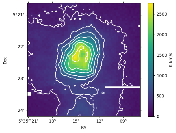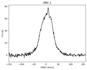 Examples of data taken in January 2026 for KUNTUR commissioning: Left, an integrated image of OMC-1, taken as 1 ~1hr raster scan observation. Right, the OMC-1 central spectra from that raster scan smoothed to 1 km/s channels.