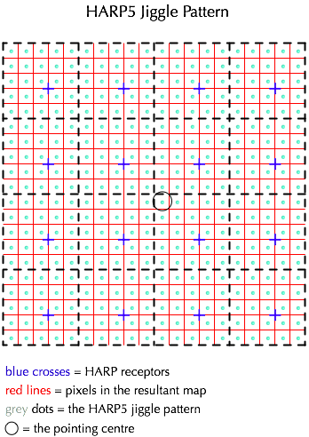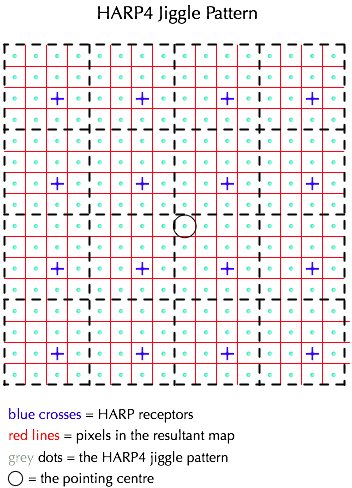 Whilst technically any grid-pattern can be selected for the jiggle mode (e.g. a 3 x 3 or 9 x 9 step map), two pre-designed modes are offered for the HARP array: HARP4, which is a 4 x 4, 16 point jiggle, producing 7.5″ spacing, and is thus slightly under-sampled, and HARP5, a 5 x 5, 25 point jiggle, with 6″ spacing, and slight over-sampling. The spacing for the jiggle mode can also be user-defined for the HARP and Nāmakanui in the JCMT OT.