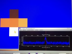 The results of an example (HARP) pointing experiment are shown below. The inset (blue) spectra correspond to the positions within the ‘five-point’ indicated by the small arrow. The color scale used in displaying the fivepoint usually relates white with the strongest spectral line strength